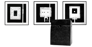 Michel Thamin a choisi de s’imposer un maximum de contraintes pour réaliser ses ”cellules”, un travail de dessin sur papier. Trois acryliques noires de matité et de brillance différentes, un crayon graphite 3H, et un rectangle noir dans lequel s’inscrivent différentes formes ou signes rappelant les micro-architectures de l’intérieur de ses Lithoglyphes. Systématiquement, des ‘chemins/échelles’ traversent ou pénètrent cet espace noir.